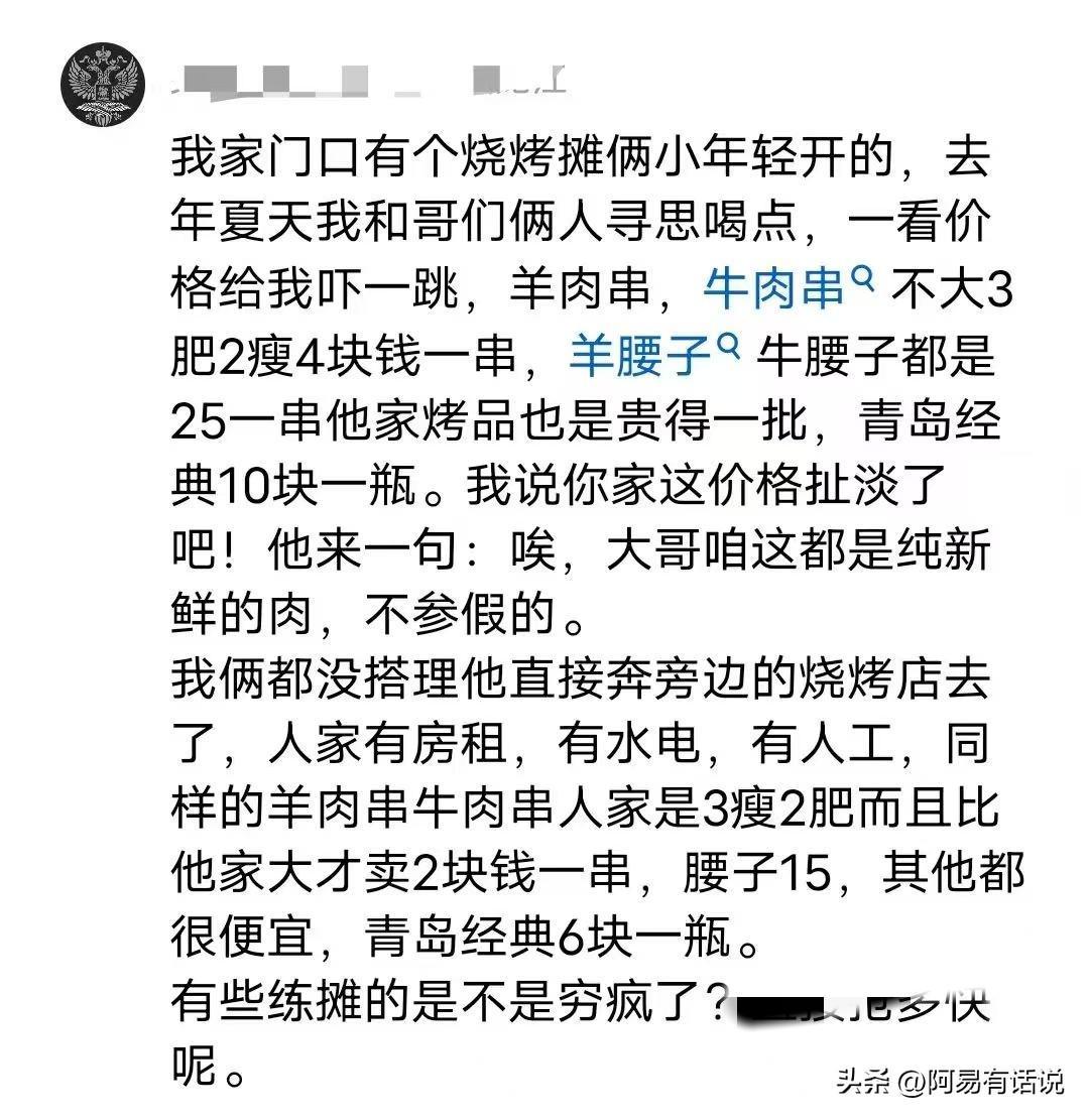 在路边上还吃了一次烧烤,真的比店里还贵,路边的麻辣烫如果你挑的少低于多少钱还不给做,从那以后路边摊就很少吃了